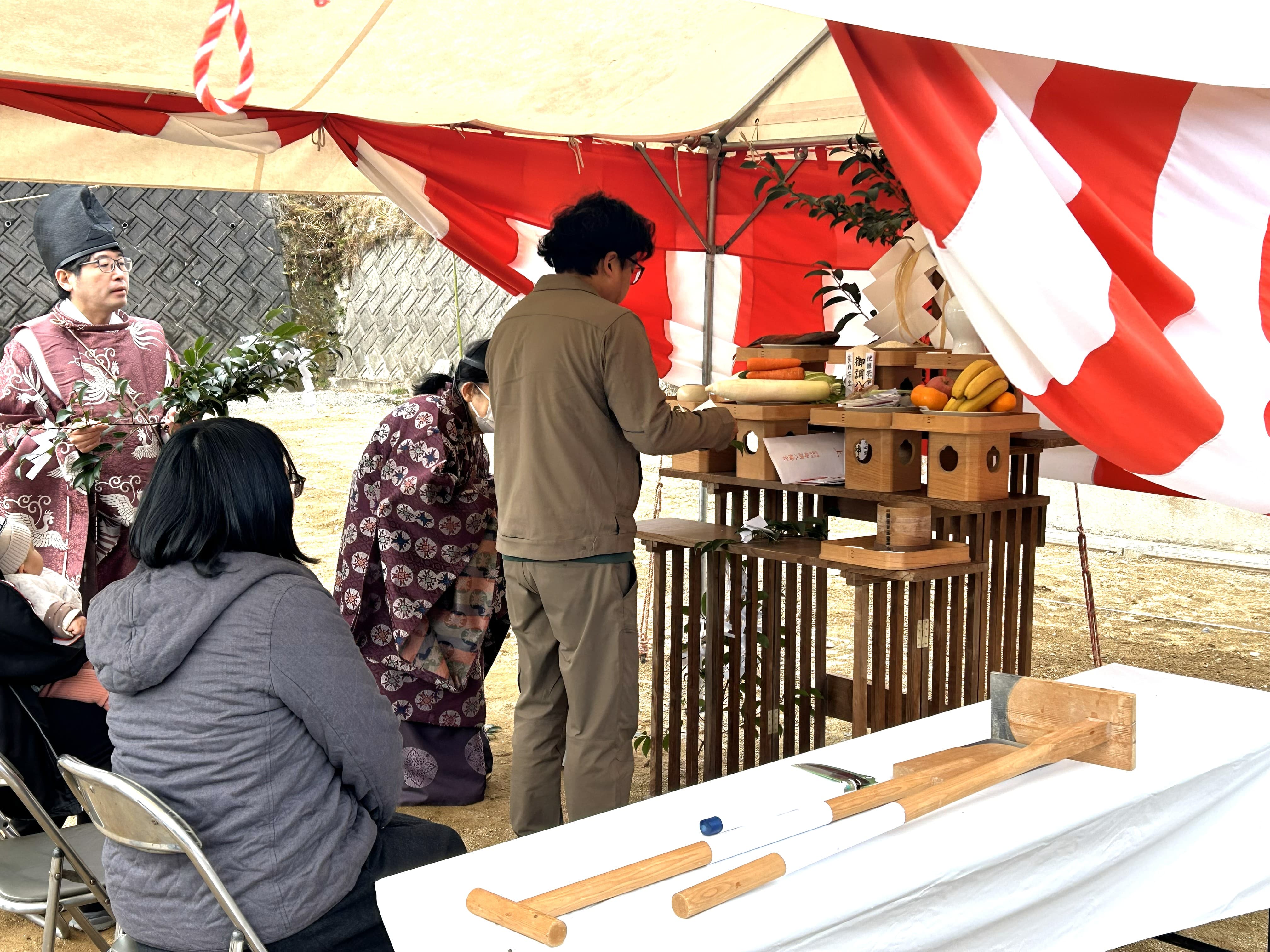 祭壇の前で拝礼するお施主様と、用意された鍬入れの道具。ます。 |